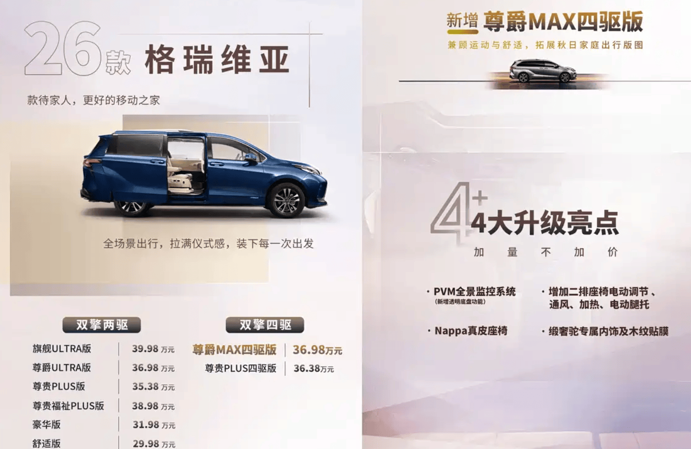 此次改款的核心亮点在于配置的全面升级。新车将配备PVM全景监控系统,提升驾驶安全性;座椅方面,二排座椅新增电动调节功能,并支持通风、加热及电动腿托,搭配Nappa真皮材质与缎奢驼专属内饰,营造出更高级的乘坐体验。木纹贴膜的加入进一步提升了内饰质感。标配配置同样丰富,包括前排电动天窗、双侧电动侧滑门、电动调节外后视镜、第二排/第三排隐私玻璃、第二排遮光帘等实用功能,同时支持HUAWEI HiCar、CarPlay及CarLife手机互联,满足多元化智能需求。
